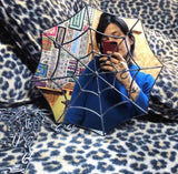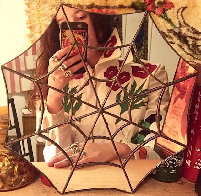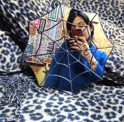 12 inch glass spider web mirror, available in different colors upon request. If you want a different color make sure you write it in the notes! Please refer to homepage for current lead times